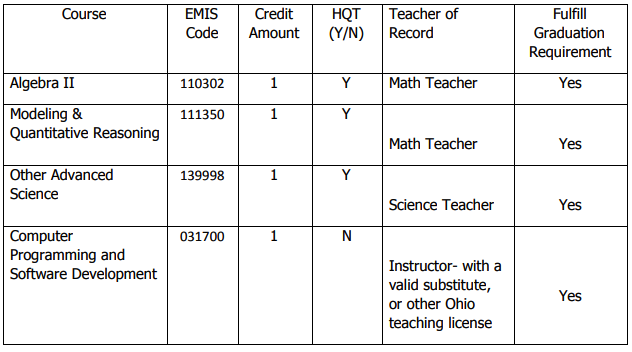 - At the completion of the program, the instructor is to complete a Credit Submission sheet and turn it into the Curriculum & Instructor Director. Curriculum & Instructor Director will arrange a meeting with necessary Teacher of Record(s) to review course work and sign off on the credit. Once all parties agree and sign Credit Submission Form, Curriculum and Instruction Director will turn it into Academic Affairs. The grade(s) will be awarded within 48hrs of completion. Students who successfully complete the course will be awarded the following credit: